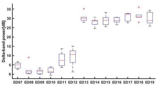 Top. Spectral power density: ED07-ED12 revealed no prominent power in all relevant frequency bands, apart from some minor but consistent oscillations in the low delta regions around 1–2 Hz and an isolated signal at 16.33 Hz. The onset of slow delta oscillations is visible from ED13 onwards. For each developmental day, data from 6 representative EEGs were processed. Bottom: Boxplots illustrating the median (red line), the 25% and 75% percentiles (lower and upper box end) and the minimum/maximum values (lower and upper whisker) for the delta band power. Red crosses indicate outliers. AUCED10/ED11: 0.97 [0.83, 1], AUCED12/ED13: 1 [1, 1], only significant AUCs reported (refer to Table 2 for other data).