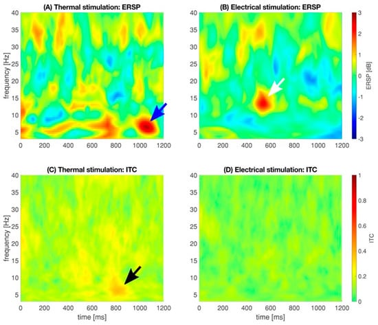 Figure 4 represents the median event-related spectral perturbation and inter-trial coherence for thermal and electrical stimulation. After applying a threshold of ±2 dB to unmask stimulus-related EEG activities, a single local maximum of 2.79 dB [−2.15 dB/5.16 dB] at 6.41 Hz and 1052 ms was measured after thermal stimulation. After electrical stimulation, a local maximum of 2.23 dB [0.68 dB/2.23 dB] at 13.24 Hz and 543 ms was detected. No further ERSP responses were found.