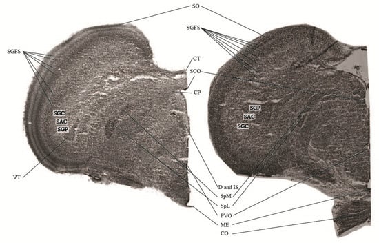 Anatomical differences of the embryonal brain: The two frontal sections (100 µm) from the central brain area represent the neuronal development of the embryonal brain from ED13 (right) and ED19 (left). Abbreviations: CO: Chiasma opticum, CP: Commissura posterior [caudalis] (Posterior commissure), CT: Commissura tectalis, D: Nucleus of Darkschewitsch; Nucleus paragrisealis centralis mesencephali (ICAAN), IS: Nucleus interstitialis (Cajal), ME: Eminentia mediana (Median eminence), PVO: Organum paraventriculare (Paraventricular organ), SAC: Stratum album centrale, SCE: Stratum cellulare externum, SCO: Organum subcommissurale (Subcommissural organ), SGC: Stratum granimalsiseum centrale, SGFS: Stratum griseum et fibrosum superficiale, SGP: Stratum griseum periventriculare, SO: Stratum opticum, SpL: Nucleus spiriformis lateralis, SpM: Nucleus spiriformis medialis, VT: Ventriculus tecti mesencephalic. The anatomical nomenclature was referred to anatomical atlases [15,46].