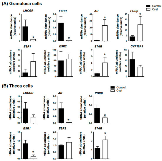 We first confirmed if the spontaneously occurring cystic follicles collected from the abattoir presented the same expression pattern expected for classic markers for COD such as progesterone receptor beta (PGRb), androgen receptor (AR), steroidogenic acute regulatory protein (STAR), luteinizing hormone (LHCGR), follicle stimulating hormone receptor (FSHR) and estrogen receptors type 1 (ESR1) and 2 (ESR2). Abundance of mRNA encoding PGRb, AR and STAR was significantly increased in GCs from cysts compared to control GCs, and mRNA levels for both LHCGR and FSHR were significantly lower in cyst CGs in comparison to controls (p < 0.05; Figure 1A). Although a clear tendency was observed, neither ESR1 nor CYP19A1 mRNA abundance was statistically altered in cysts (p > 0.05; Figure 1A). In terms of theca cells gene expression profile, while STAR mRNA abundance was significantly increased (p < 0.05; Figure 1B), PGRb, AR and ESR1 mRNA levels were significantly lower in cystic compared to control follicles (p < 0.05; Figure 1B).