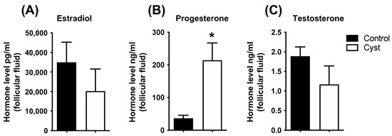 Steroids concentration in follicular fluid of control and cyst groups. Follicular fluid steroid concentrations for estradiol (A), progesterone (B) and testosterone (C) were measured by liquid chromatography–tandem triple quadrupole mass spectrometry. Data represent the mean ± SEM of independent follicle samples (n = 10) per group. An asterisk (*) indicates significant difference between groups (p < 0.05).