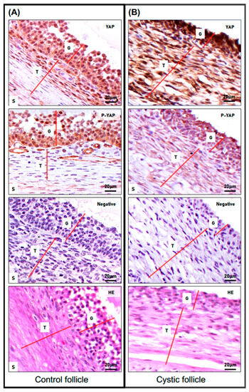 Expression pattern of total and phosphorylated YAP proteins in spontaneous cystic follicles in cows. Immunohistochemistry (IHC) analysis was used to compare the cellular and subcellular localization of total and phospho-YAP (P-YAP; Ser 127) proteins in control non-cystic large follicles (A) and in spontaneous cystic follicles (B). The red lines differentiate the distinct cell layers observed in the images (G: granulosa cells; T: theca cells; S: stromal cells). Representative IHC images of staining for total and phospho-YAP (objective 63×) and their antibody control (NEG) showing negative staining of total YAP and phospho-YAP (objective 63×). Structure and cellular architecture of both groups can be observed in the H&E representative images.