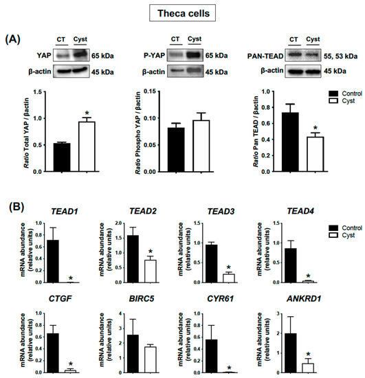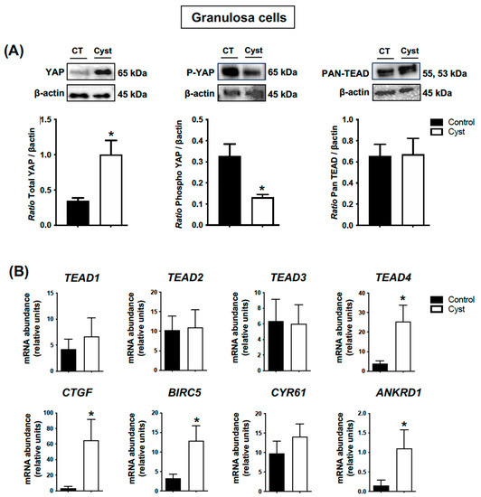 To complement our IHC analyses and to better assess if YAP total protein levels were indeed augmented in GCs isolated from cyst group samples, we then employed Western blot analyses. The results demonstrated that total YAP protein levels were significantly higher in GCs from cystic follicles in comparison to GCs from control follicles, but also that phospho-YAP abundance was decreased (p < 0.05; Figure 4A) whereas total TEAD protein levels (Pan-TEAD) were not different.