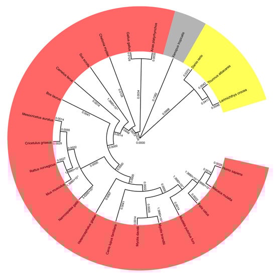 To study the molecular evolution and analyze phylogenetic relationships of pMID2 to its homologous proteins in other species, we constructed a phylogenetic tree of MID2 based on amino acid sequences with MEGA-X software (10.1.8) (Figure 1). We analyzed 23 species, including Danio rerio, Cricetulus griseus, Myotis brandtii, Myotis davidii, Xenopus tropicalis, Canis lupus familiaris, Rattus norvegicus, Mesocricetus auratus, Thunnus albacares, Mustela putorius furo, Heterocephalus glaber, Chelonia mydas, Nannospalax galili, Camelus ferus, Macaca mulatta, Larimichthys crocea, Gallus gallus, Felis catus, Bos taurus, Homo sapiens, Mus musculus, Anas platyrhynchos, and Sus scrofa. The phylogenetic analysis revealed that pMID2 was closely clustered with homologues from other vertebrates, suggesting that pMID2 shares a common ancestor in 23 species.
