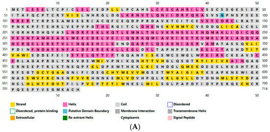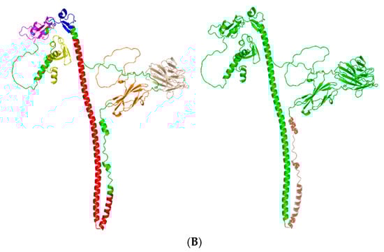 Structure analysis of pMID2. (A) Secondary structure prediction of pMID2 proteins using PSIPRED server. The α-helix region is marked in pink, β-strand in yellow, and extended coil region in gray. The predicted pMlD2 protein has a 27.8% α-helical structures and 20.45% extended strand according to GOR4 [https://npsa-prabi.ibcp.fr/cgi-bin/npsa_automat.pl?page=npsa_gor4.html (accessed on 30 July 2023)] prediction. (B) Three-dimensional structure of pMID2 was performed by Swiss Model [SWISS-MODEL.expasy.org (accessed on 20 May 2023)]. Three-dimensional structure is colored as yellow, magenta, blue, red, orange, wheat, which represent RING-HC_MID2, Bbox1_MID2_C-I, Bbox2_MID2_C-I, BBC, FN3, SPRY_PRY_MID2 domains in order. COS domain overlaps with BBC; COS domain is shown at right as brown. Homology models with best quality scores were selected and visualized with PyMOL program.