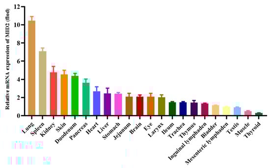 To characterize the expression of pMID2 mRNA in different tissues, total RNAs were extracted from the porcine heart, liver, spleen, lung, kidney, larynx, stomach, pancreas, thyroid, testis, thymus, skin, eye, muscle, bladder, trachea, brain, duodenum, jejunum, ileum, inguinal lymphaden, and mesenteric lymphaden and subjected to RT-qPCR analysis. As shown in Figure 3, pMID2 was generally expressed in all the detected porcine tissues. The mRNAs of pMID2 in the lung, spleen, kidney, skin, duodenum, pancreas, heart, liver, stomach, jejunum, brain, eye, and larynx displayed a higher expression, while the mRNAs in the ileum, trachea, thymus, inguinal lymphaden, bladder, mesenteric lymphaden, testis, muscle, and thyroid showed the least amount of expression. These data indicated that pMID2 was ubiquitously expressed in all the tissues examined in pigs. The tissue distribution of pMID2 expression was abundant in lung and spleen, which are the two important immune-related tissues. The results imply that pMID2 might have a role in immune processes.