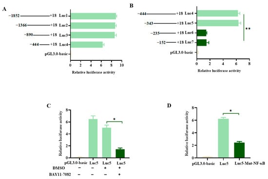 The 5′-deletion analysis of the promoter activity of pMID2 and site-directed mutation of an important cis-element. (A,B) HEK293T cells were co-transfected with different truncated pMID2 promoter report plasmids and pRL-TK, and 48 h later the cells were harvested for luciferase assays. (C) HEK293T cells were treated with DMSO or NF-kB inhibitor (BAY11-7082;) for 1 h, and followed by co-transfection of pMID2 promoter report plasmid (Luc5) or pGL3.0-basic with pRL-TK. Forty-eight hours later, cells were harvested for luciferase assay. (D) HEK293T cells were co-transfected with pMID2 promoter report plasmid (Luc5) or mutant vector (Luc5-Mut-NF-κB) along with pRL-TK or pGL3.0-basic for 48 h and then harvested for luciferase assay. We found 1870 bp of the 5′ promoter region of pMID2 (−1852 to +18 corresponds to the transcription initiation site) was linked to the luciferase gene, designated −1852/+18 (Luc1). Serial constructs in which the promoter region was deleted are depicted. The resultant plasmids were named −1366/+18 (Luc2), −890/+18 (Luc3), and −444/+18 (Luc4). Serial 5′-deletion constructs generated for −444/+18. The resultant plasmids were named −343/+18 (Luc5), −235/+18 (Luc6), and −152/+18 (Luc7). Mutation of a cis-element on −343/+18 (Luc5-Mut-NF-κB), which was predicted to be a NF-κB binding site. Error bars: means ± SDs of 3 independent tests. Student’s t-test: * p < 0.05; ** p < 0.01 compared to control.
