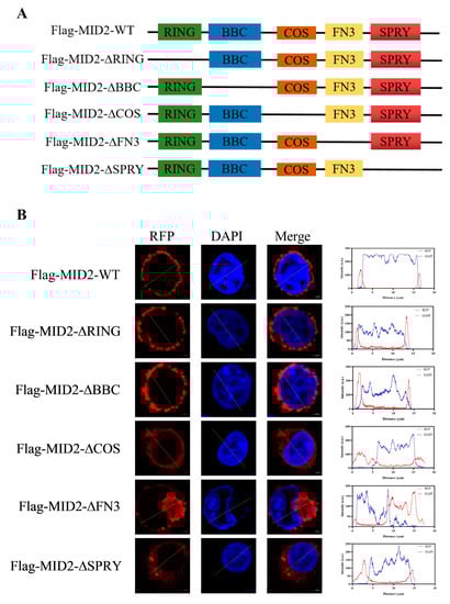 Tripartite-motif (TRIM) proteins represent one of the largest classes of E3 ubiquitin ligases that regulate a variety of biological processes including development, cell proliferation, differentiation, signal transduction, tumor suppression, disease pathology, and innate immunity [,,]. The TRIM family is ubiquitously expressed. With a long evolutionary history, the tripartite structure is highly conserved among metazoans, and it varies depending on the type of TRIM proteins []. The TRIM proteins are characterized by a conserved N-terminal, really interesting new gene (RING) domain, B-box motifs, and the coiled-coil domain, and additionally harbor a highly variable carboxyl-terminal domain in the C-terminal. The TRIM family has been subdivided into 11 distinct subgroups (C-I to C-XI,) according to the highly variable carboxyl-terminal domain []. Midline2 (MID2), known as TRIM1, is a member of the TRIM family. MID2 has an RBCC (RING-finger, B-boxes, and coiled-coil) motif in the N-terminal region, a subgroup one signature (COS) box, a fibronectin type III (FN3) repeat, and a SPIa and the ryanodine receptor (PRY-SPRY) domain in the C-terminal region as all C-I subfamily TRIM members []. While the role of FN3 domain and PRY-SPRY domain in MIDs proteins is unclear, the COS domain was shown to mediate MID2′s association with the microtubular apparatus []. MID2 and its homolog MID1 (known as TRIM18), either as homo- or hetero-dimerization, have been shown to regulate intracellular signaling to microtubules for promoting cell division [].