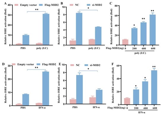 pMID2 enhances poly (I:C)/IFN-α-induced ISRE promoter activity. (A,D) ISRE promoter reporter vectors along with pRL-TK were co-transfected with Flag-MID2 or empty vector into CRL-2843 cells for 24 h, followed by incubation with poly (I:C) (10 μg/mL) (A) or porcine IFN-α (10 U/mL) (D) for 6 h. Then, cells were harvested for luciferase assay. (B,E) CRL-2843 cells were transfected with the NC, or si-MID2, and ISRE promoter reporter vectors along with pRL-TK for 24 h and then stimulated with poly (I:C) (10 μg/mL) (B) or porcine IFN-α (10 U/mL) (E). Cells were collected 6 h later for luciferase assay. (C,F) ISRE promoter reporter vectors along with pRL-TK were co-transfected with different concentrations of Flag-MID2 or empty vector into CRL-2843 cells for 24 h, followed by incubation with poly (I:C) (10 μg/mL) (C) or porcine IFN-α (10 U/mL) (F) for 6 h. Then cells were harvested for luciferase assay. Error bars: means ± SDs of 3 independent tests. Student’s t-test: * p < 0.05; ** p < 0.01 compared to control.