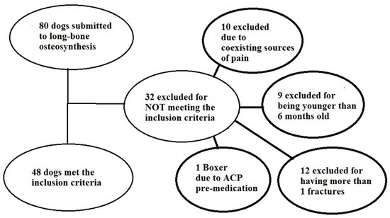 During the three and a half years of this research, 80 dogs were presented to the clinic for osteosynthesis of long-bone fractures. Of these, 32 were not included in the study, because they did not meet the inclusion criteria or met at least one of the exclusion criteria. The flowchart below (Figure 1) presents, in detail, the reasons why those dogs were excluded. Twelve animals were excluded because they had more than one fracture, ten because other sources of pain coexisted (multiple soft tissue injuries, thoracostomy tube placement), nine because they were younger than six months and one due to breed considerations (Boxer judged unsuitable to receive acepromazine premedication) (Figure 1).