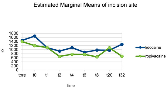 Mean pain threshold at the incision site at individual time points (t-pre to t32) in the groups of dogs that received either a ropivacaine (group R-mid) or a lidocaine (group L) hematoma block.