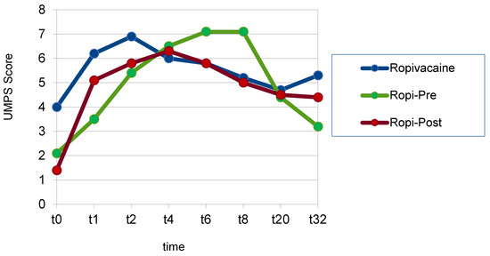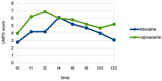 The UMPS score in group L (4 ± 0.2) was statistically significantly lower than in group Rmid (6 ± 0.3) (p = 0.001). Group L had lower UMPS pain scores at all time points, with the difference being statistically significant at t1 (p = 0.026) and t2 (p = 0.003) (Figure 3) (Table 2).