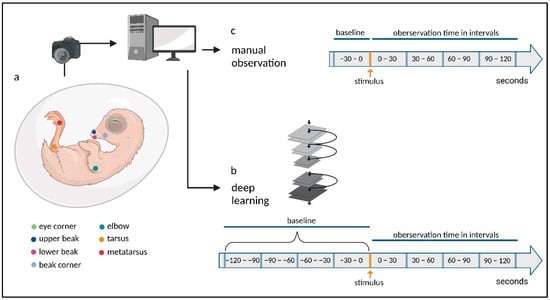 Flowchart of the experimental procedures. (a) Recordings of the embryo were collected in ovo, and video data were transferred to a computer for editing. The body parts of chicken embryos tracked by DLC are labeled in the schema. (b) The neural network was trained, and the video material was analyzed according to the timeline. (c) The video material was manually analyzed according to the timeline. (Created with BioRender.com, accessed on 6 September 2023).