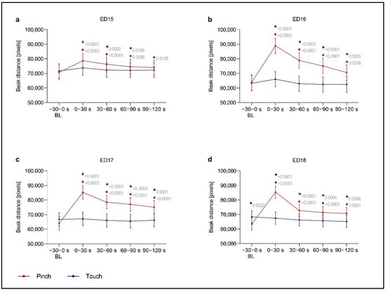 We analyzed the movements of chicken embryos in response to a noxious stimulus applied to the beak from ED9 to ED18. Consistent with the assumption that a response to a stimulus is expected at the site of stimulus application, as was shown for well-innervated regions such as the beak [], our DLC data for Beak Angle and Beak Distance showed the most noticeable changes after the stimulus. Both parameters, Beak Angle and Beak Distance, quantified beak movements. A significant increase in beak movements was detected immediately after Pinch from ED15 to ED18. As the increase in beak movements during Post Pinch was significant compared to those during Baseline Pinch and Post Touch, we assumed that the increase in beak movements was a reaction to the noxious stimulus and was not a random movement of the chicken embryos.