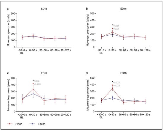 Eye Corner Movement. This variable was used to detect head movements of embryos at (a) ED15 (n = 16), (b) ED16 (n = 16), (c) ED17 (n = 16) and (d) ED18 (n = 15) before and after application of two stimuli (Touch and Pinch). The total distance in pixels across 30 s intervals (1500 frames) was evaluated. Plots show the estimated mean ±95% confidence intervals at the following 30 s intervals from Baseline (BL) to post-stimulation, with stimulation occurring at 0 s: −30–0, 0–30, 30–60, 60–90 and 90–120 s. Robust linear mixed effects were applied for all analyses. All contrasts (differences) between particular groups were assessed after model-fitting by the estimated marginal means with Tukey’s p value correction for multiple comparisons. Touch: blue; Pinch: red. * Significant difference between Pinch and Touch; ♦ Significant difference from baseline. p values shown.