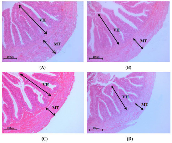 Intestinal morphology of Anguilla rostrata juveniles. (A) Control group; (B) LQBFM20+CAs group; (C) LQBFM30+CAs group; (D) LQBFM40+CAs group. VH: villus height; MT: muscular thickness.