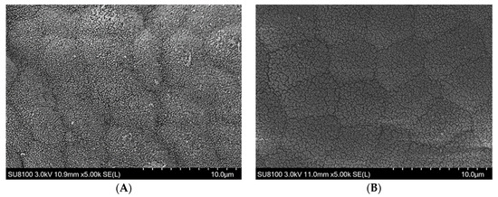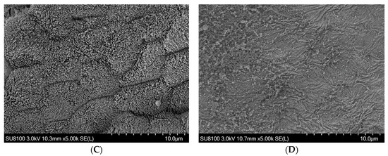 Intestinal microvilli of Anguilla rostrata juveniles. (A) Control group; (B) LQBFM20+CAs group; (C) LQBFM30+CAs group; (D) LQBFM40+CAs group. Instrument model: SU8100 (Hitachi Regulus 8100, Hitachi, Tokyo, Japan); working voltage: 3.0 kV; working distance (from lens to sample): 10.3–11.0 mm; magnification: 5.00 k; photo mode: SE(L).