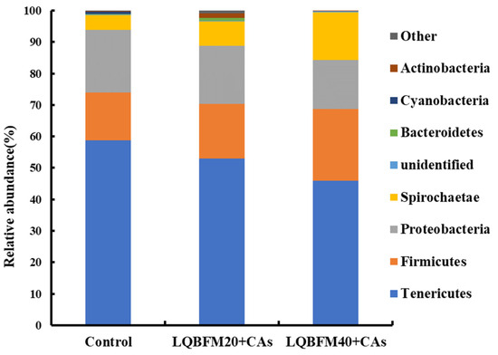 As illustrated in Figure 3, the microbiota compositions of the control, LQBFM20+CAs, and LQBFM40+CAs groups were dominated by Tenericutes, Firmicutes, Proteobacteria and Spirochaetae. With the increase in the proportions of LQBFM in the diets, there was a decreasing trend in the relative abundances of Tenericutes and Proteobacteria, while there was an increasing trend in the relative abundances of Firmicutes and Spirochaetae.