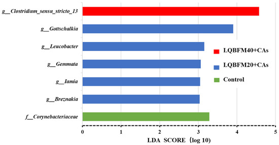 As illustrated in Figure 4, the relative abundance of Corynebacteriaceae was higher in the control group, while the relative abundances of Gottschalkia, Leucobacter, Gemmata, Iamia and Breznakia were higher in the LQBFM20+CAs group and the relative abundance of Clostridium-sensu-stricto-13 was higher in the LQBFM40+CAs group.