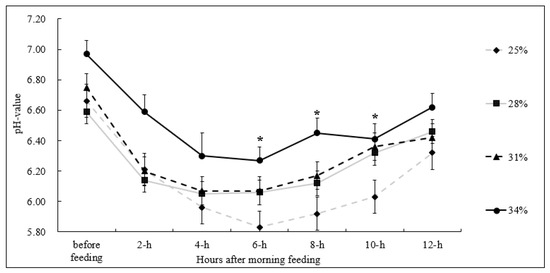 25% NDF group = dashed gray line (♦); 28% NDF group = solid gray line (■); 31% NDF group = dashed black line (▲); 34% NDF group = solid black line (●). Treatment differences (p < 0.05) are represented by (*); error bars represent the standard error of the mean.