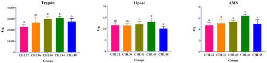 As shown in Figure 2, the activities of three digestive enzymes including trypsin, lipase and AMS in the intestinal tract of L. vannamei showed a trend of increasing and then decreasing with the increase of dietary protein level, and all of them were significantly different (p < 0.05). Among them, the activity of trypsin in the CHL40, CHL44 and CHL48 groups was significantly higher than that in the CHL32 group (p < 0.05), but there was no significant difference among the CHL36, CHL40, CHL44 and CHL48 groups (p > 0.05). Lipase activity was significantly higher in the CHL40 and CHL44 groups than in the CHL48 group (p < 0.05), and there was no significant difference between the remaining groups (p > 0.05). Besides that, the AMS activity in the CHL44 group was significantly higher than the other four groups (p < 0.05), and there was no significant difference between the other four groups (p > 0.05).
