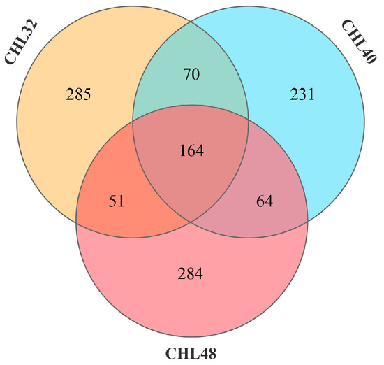 Based on the effect of dietary protein level on the growth performance of L. vannamei, the intestinal microbiota of L. vannamei in the CHL32 group with low protein level, the CHL40 group with appropriate protein level and the CHL48 group with high protein level were analyzed. After quality control and read assembly (Table 4), all OTU with an average abundance of more than 1 were selected for Venn diagram analysis (https://omicshare.com/tools/Home/Soft/venn, accessed on 18 April 2023) when the effective label was more than 85%, so as to distinguish the same and different OTUs in the samples from different groups. As shown in Figure 3, the intestines of L. vannamei in the three groups shared 164 identical OTUs, and there were 285, 231 and 284 unique OTUs in the CHL32, CHL40 and CHL48 groups, respectively.