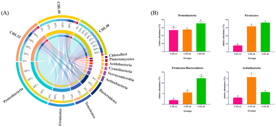 At the phylum level, the top 10 species were Proteobacteria, Firmicutes, Tenericutes and Bacteroidetes. Actinobacteria, Verrucomicrobia, Cyanobacteria, Acidobacteria, Planctomycetes and Chloroflexi were the subdominant phylum (Figure 4A). As shown in Figure 4B, the relative abundance of Proteobacteria and Firmicutes as well as the ratio of Firmicutes to Bacteroidetes in the intestine of L. vannamei increased significantly with the increasing dietary protein levels (p < 0.05), reaching the highest level in the CHL48 group. The relative abundance of Firmicutes and the ratio of Firmicutes to Bacteroidetes were significantly different among the three groups (p < 0.05) but the relative abundance of Proteobacteria was significantly higher only in the CHL40 group than that in the other two groups (p < 0.05). In addition, the relative abundance of Actinobacteria were significantly different among the three groups, with the maximum in the CHL40 group (p < 0.05). The relative abundance of Actinobacteria in the CHL48 group was significantly lower than the CHL40 group and significantly higher than the CHL32 group (p < 0.05).