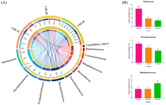 As shown in Figure 5A, the top 10 species of the intestinal microbiota L. vananmei at the family level were Vibrionaceae, Mycoplasmataceae, Erysipelotrichaceae, Flavobacteriaceae, Enterobacteriaceae, Moraxellaceae, Rhodobacteraceae, Leuconostocaceae, Rubritaleaceae and Cymbidium_faberi. The relative abundance of Vibrionaceae and Flavobacteriaceae in the intestine of L. vannamei decreased significantly and the relative abundance of Rhodobacteraceae increased significantly with the increase of dietary protein level (p < 0.05). Among them, the relative abundances of Flavobacteriaceae were significantly different among all the three groups (p < 0.05). The relative abundance of Vibrionaceae and Rhodobacteraceae were highest in the CHL32 and CHL48 groups, respectively (p < 0.05), which were significantly higher than that in the other two groups (Figure 5B).