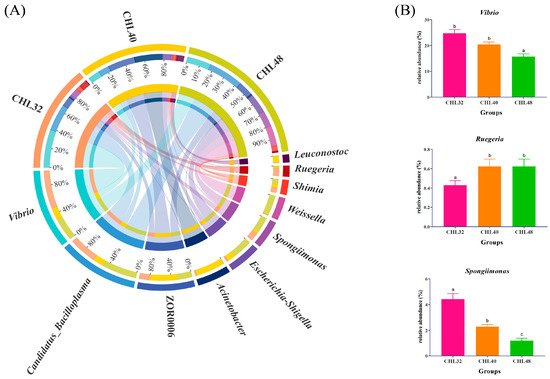 At the genus level, Vibrio, Candidatus_Bacilloplasma, ZOR0006, Acinetobacter and Escherichia-Shigella were the major dominant genera. Spongiimonas, Weissella, Shimia, Ruegeria and Leuconostoc were the second dominant genera (Figure 6A). As shown in Figure 6B, the relative abundance of Vibrio and Spongiimonas significantly decreased while the relative abundance of Ruegeria significantly increased with the increasing dietary protein levels (p < 0.05). The relative abundance of Vibrio was not significantly different between the CHL32 and CHL40 groups but both of them were significantly higher than that in the CHL48 group. The relative abundance of Ruegeria was not significantly different between the CHL40 and CHL48 groups but both of them were significantly higher than that in the CHL32 group. Besides, the relative abundances of Spongiimonas were significantly different among all the three groups (p < 0.05).