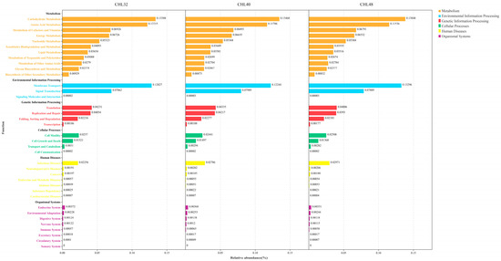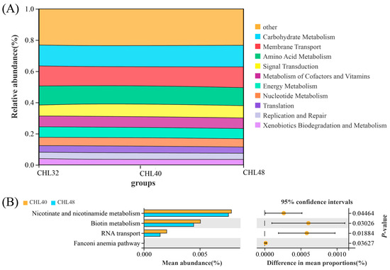 The functions of the L. vannamei intestinal microbiota were predicted using Tax4fun version 2020, and a total of 37 categories of functions including carbohydrate metabolism, amino acid metabolism, metabolism of cofactors and vitamins were predicted (Figure 7). The top 10 predicted functions in relative abundance were carbohydrate metabolism (relative abundance 13.57%), amino acid metabolism (relative abundance 11.82%), metabolism of cofactors and vitamins (relative abundance 6.87%), functions related to energy metabolic signalling (relative abundance 6.63%), nucleotide metabolism (relative abundance 5.33%), xenobiotics biodegradation and metabolism (relative abundance, 3.75%), lipid metabolism (relative abundance 3.58%), metabolism of terpenoids and polyketides (relative abundance 2.82%), metabolism of other amino acids (relative abundance 2.76%) and glycan biosynthesis and metabolism (relative abundance 2.54%), respectively (Figure 8A). Welch’s t-test showed that Nicotinate and nicotinamide metabolism, Biotin metabolism and RNA transport-related functions were significantly higher in L. vananmei in the CHL40 group when compared to the CHL48 group at KEGG pathway level 3 (Figure 8B).