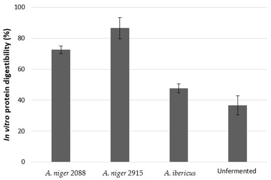 The in vitro protein digestibility tended to increase from 36.6% to 72.6% and 86.6% with SSF of A. niger CECT 2088 and A. niger CECT 2915, respectively (Figure 1).