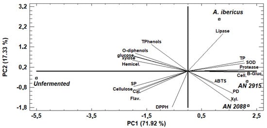 Biplot graph of the principal component analysis. TP, total protein; Cell., cellulase activity; Xyl., xylanase activity; B-Gluc., β-glucosidase activity; PD, protein digestibility; TPhenol, total phenols; SP, soluble protein; Hemicel, hemicellulose; Cal., energy; AN, Aspergillus niger.