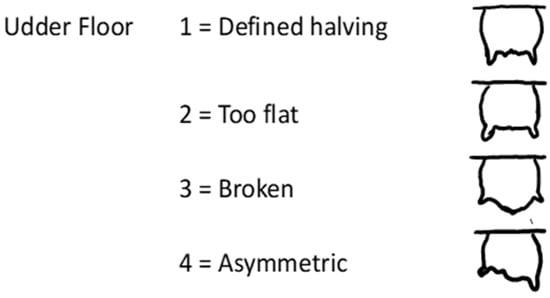 Scoring system used to assess udder floor consisting of defined halving (1), too flat (2), broken (3), and asymmetric (4) [2].