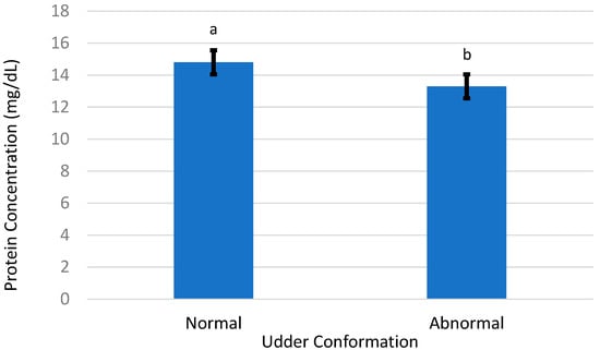 Mean colostrum total protein from Suffolk ewes with ‘normal’ and ‘abnormal’ udder conformations; a,b, bars with different letters differ (p = 0.03).