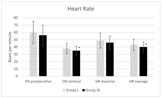Preoperative and intraoperative minimal, maximal and average heart rates (HR) during isoflurane anesthesia for equine colic surgery. Group lidocaine (L) and group xylazine–lidocaine (XL). * Statistical difference (p < 0.05).