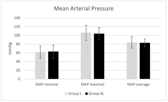No differences were found for the end-tidal percentage of isoflurane (Group L: 0.97 ± 0.13, Group XL: 0.93 ± 0.13, p = 0.09) or the percentage of animals that required dobutamine, noradrenaline boluses, noradrenaline infusion or colloids (Table 4).
