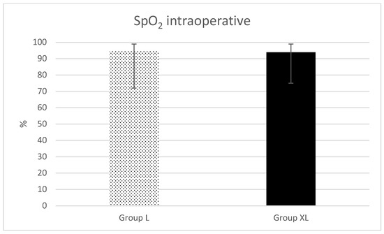 Peripheral oxygen saturation (SpO2) intraoperatively during isoflurane anesthesia for equine colic surgery. Group lidocaine (L) and group xylazine–lidocaine (XL).