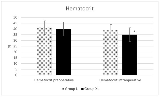 The blood gas analyses did not show any statistical differences. Data can be found as Supplementary Data (Table S1). Intraoperative hematocrit (Figure 4) was significantly lower (p = 0.001) in group XL.