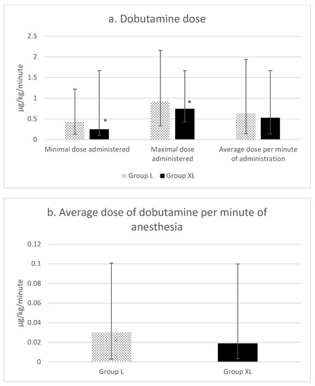 There were no differences in the amount of time in which dobutamine was administered (Group L: 98 ± 46 min, Group XL: 85 ± 46 min, p = 0.23), in the average dose per minute of administration or in the average dose per minute of anesthesia (Figure 5). However, there were significant differences for the minimal (p = 0.002) and maximal (p = 0.041) doses of dobutamine used, which were lower in group XL (Figure 5a).