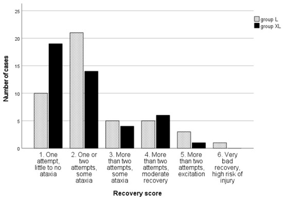 Number of cases by recovery score for groups lidocaine (L) and xylazine–lidocaine (XL) after isoflurane anesthesia for equine colic surgery, p = 0.26.