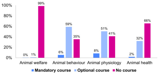 The proportion of the 596 programs that offer a mandatory, optional, or no course on animal welfare, animal behaviour, animal physiology, or animal health (see Table S1 for more details).