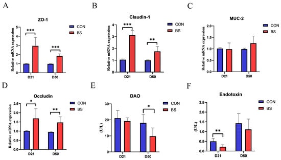Effects of BS on tight junction protein mRNA expression, serum DAO activity, and endotoxin activity of broilers on day 21 and day 50. (A) ZO-1; (B) MUC-2; (C) Claudin-1; (D) Occludin; (E) DAO; (F) Endotoxin; * p < 0.05, ** p < 0.01, and *** p < 0.001 compared with CON group. CON, control; BS, Bacillus subtilis HC6; DAO, diamine oxidase.