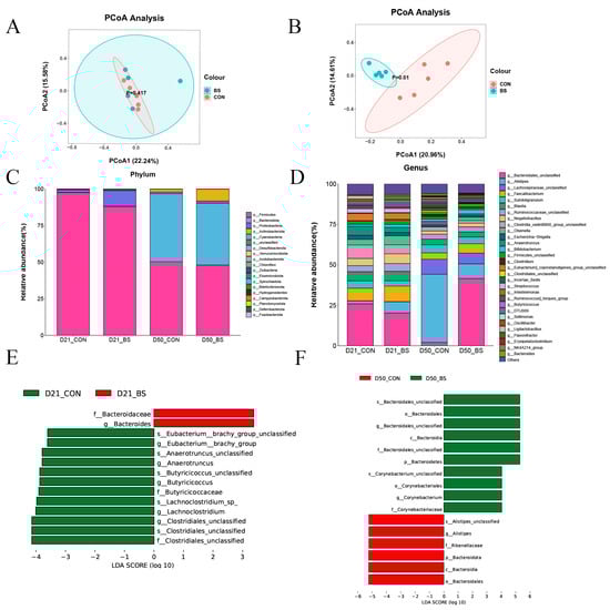 Relative abundance of the chicken cecal microbiota; (A) D 21 principal coordinate analysis plot; (B) D 50 principal coordinate analysis plot; (C) Phylum-level taxonomic composition of the cecal microbiota; (D) Genus-level taxonomic composition and relative abundance of the cecal microbiota; (E) Lefse identified the most differential genera on 21 days; (F) Lefse identified the most differential genera on 50 days. CON, control; BS, Bacillus subtilis HC6.