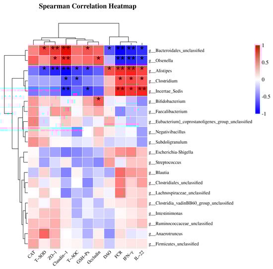 As shown in Figure 3, the top 20 most abundant species at the genus level were selected, and Spearman correlation analysis was performed between bacterial taxa and differential indicators to explore potential links, such as FCR, antioxidant parameters (CAT, T-SOD, T-AOC and GSH-Px), inflammation biomarkers (IFN-γ and IL-22), and intestinal mucosal barrier function (endotoxin, DAO, ZO-1, Occludin and Claudin-1). There were two distinct groups based on the strong correlation between the genera and the parameters. Group 1, including Bacteroidales_unclassified and Olsenella, was positively correlated with T-SOD, T-AOC, GSH-Px, ZO-1, Occludin, and Claudin-1, and was negatively correlated with FCR, DAO, IFN-γ, and IL-22. Group 2, including Clostridium, Alistipes, and Incertae_Sedis, was positively correlated with FCR, DAO, IFN-γ, and IL-22, and negatively correlated with T-SOD, T-AOC, GSH-Px, ZO-1, Occludin, and Claudin-1.