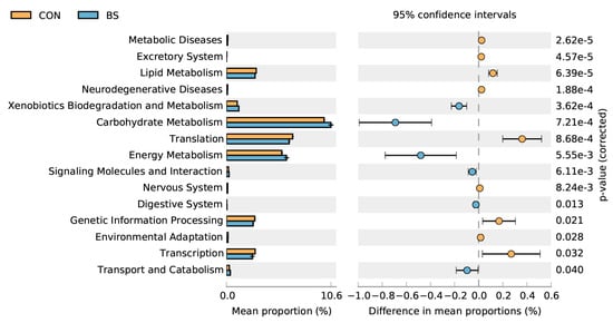 PICRUSt 2 microbial functional analysis results determined that BS treatment significantly (p < 0.05) enriched six metabolic pathways, including xenobiotics biodegradation and metabolism, carbohydrate metabolism, energy metabolism, signaling molecules and interaction, the digestive system, transport, and catabolism, and downregulated nine metabolic pathways, namely metabolic diseases, the excretory system, lipid metabolism, neurodegenerative diseases, translation, the nervous system, genetic information processing, environmental adaptation, and transcription.