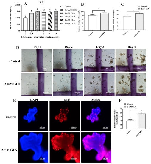 Ex vivo glutamine administration increases the activity of intestinal organoids. (A) MTT assay was used to detect the effect of different concentrations of glutamine on IPEC proliferation. The results are expressed as mean ± SEM (n = 8 wells per group). Statistical significance was determined by one-way ANOVA. Different lowercase letters indicate significant differences (p < 0.05). (B,C) Organoid-forming efficiency and budding efficiency were measured on day 4. The results are expressed as mean ± SEM (n = 5 wells per group, * p < 0.05). Statistical significance was determined by Student’s t-test. (D) Representative images of intestinal organoids cultured from the additive-free culture medium group and the 2 mM glutamine treatment group on days 1, 2, 3, and 4 (40× magnification). (E,F) Ex vivo administration of glutamine enhanced the mitosis of intestinal stem cells, as indicated by the increasing fluorescence intensity (FI) of EdU (calculated as FIs normalized to the mean FI of the control group). Representative images of intestinal organoids stained with the EdU reagent are shown in the control and 2 mM glutamine groups. The results are expressed as mean ± SEM (n = 5 organoids per group, ** p < 0.01). Statistical significance was determined by the Student’s t-test.