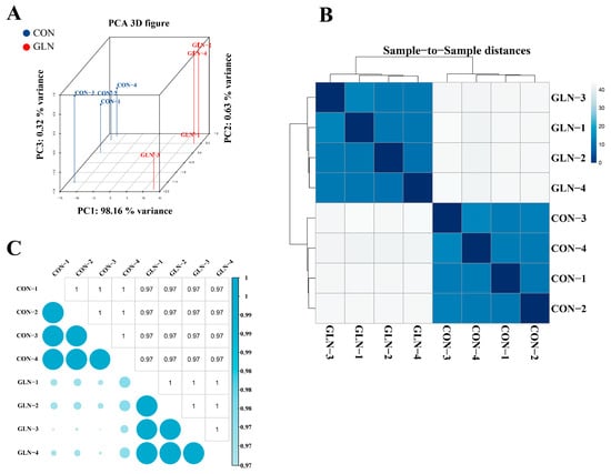 Gene expression profiles between the control and 2 mM glutamine groups. (A) Principal component analysis of the groups based on log2(FMPK + 1) corrected expression data. (B) Distances within each sample. (C) Unbiased hierarchical clustering heat map based on Pearson’s correlation coefficient for 16,201 identified genes. The ordinate and coordinates represent sample names. Color intensity indicates the correlation between samples, with dark blue indicating a high correlation.