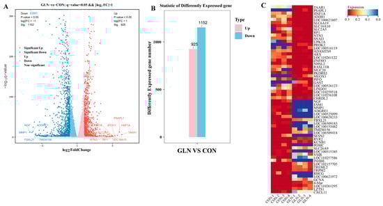 Identification of DEGs between the control (CON) and 2 mM glutamine (GLN) groups. (A) The volcano plot displays DEGs from GLN vs. CON. The x-axis represents the log2 (fold change) value, and the y-axis represents the log10 (p-value). Blue nodes represent down-regulated genes, while red nodes represent up-regulated genes. (B) Number of DEGs from GLN vs. CON. (C) Top 30 DEGs in the CON and GLN groups.