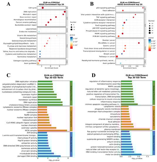 For further investigation of notable signaling pathways through which glutamine promotes intestinal epithelial cell proliferation, DEGs between the control and glutamine supplementation groups were annotated using the KEGG and GO analyses. Five aspects of organismal systems were analyzed: metabolism, human diseases, genetic information processing, and cellular processes. The up-regulated DEGs show significant enrichment in the cell cycle, valine/leucine and isoleucine degradation, and cysteine and methionine metabolism. On the other hand, the down-regulated DEGs exhibit substantial enrichment in the p53 signaling pathway, focal adhesion, TNF signaling pathway, ECM-receptor interaction, foxO signaling pathway, JAK-STAT signaling pathway, phospholipase D signaling pathway, MAPK signaling pathway, and PI3K-AKT signaling pathway (Figure 4A,B).