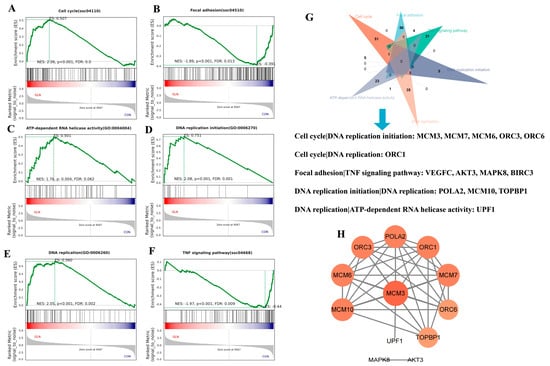 GSEA analysis was further performed to identify whether enriched gene sets showed a statistically significant difference between the groups. In the glutamine supplementation groups, there was a significant up-regulation of the cell cycle (normalized enrichment score (NES) = 2.06, p < 0.001), DNA replication initiation (NES = 2.08, p < 0.001), DNA replication (NES = 2.05, p < 0.001), and ATP-dependent RNA helicase activity (NES = 1.76, p < 0.01). Conversely, focal adhesion was down-regulated (NES = −1.89, p < 0.001) (Figure 5A–E). Notably, the glutamine supplementation group exhibited anti-inflammatory activity by downregulating the TNF signaling pathway (NES = 1.97, p < 0.001) (Figure 5F). These data provide some evidence to support the idea that glutamine promotes cell proliferation and inhibits inflammation through vital pathways, but this must be confirmed at the proteomic level and biochemically. Moreover, we identified intersecting genes (MCM3, MCM7, MCM6, MCM10, ORC1, ORC3, ORC6, VEGFC, AKT3, MAPK8, BIRC3, POLA2, TOPBP1, and UPF1) among the six crucial pathways (Figure 5G). The protein–protein association network of the intersecting genes highlighted the significance of DNA replication licensing factors (MCM3, MCM6, and MCM10) in promoting intestinal epithelial growth responding to glutamine (Figure 5H).